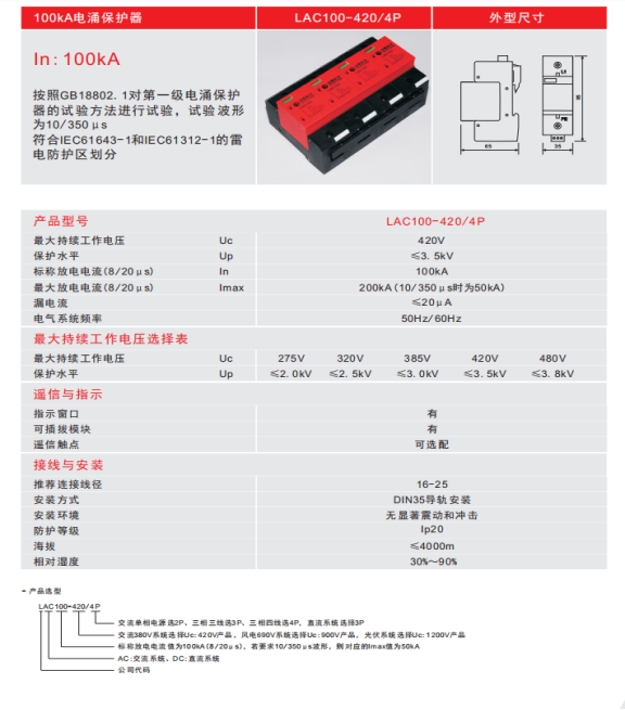 浪涌保護器(電涌保護器)又稱防雷器,簡稱(SPD)適用于交流50/60HZ,額定電壓220V至380V的供電系統(或通信系統)中,對間接雷電和直接雷電影響或其他瞬時過壓的電涌進行保護。電涌保護器LAC100-420/4P是公司的常規產品,公司提供電源類電涌保護器,能源類電涌保護器,控制類電涌保護器,視頻類電涌保護器,網絡類電涌保護器,天饋類電涌保護器等,種類多,質量可靠穩定,可根據客戶的具體保護對象和安裝方式研發生產針對具體要求。