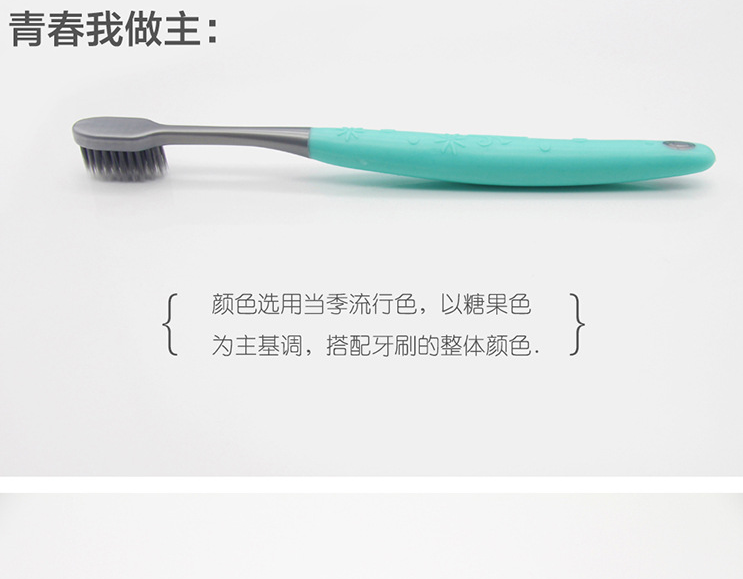 刷毛中含有竹炭C活性離子,能夠輕松吸附走牙齒表面的牙菌斑,健康潔白牙齒。超細竹炭軟毛的末端直徑比普通刷毛小,能深入到普通刷毛不能觸及的各個隙縫間深度清潔,柔軟并具超強吸附能力的竹炭刷毛呵護牙齦不受損傷。