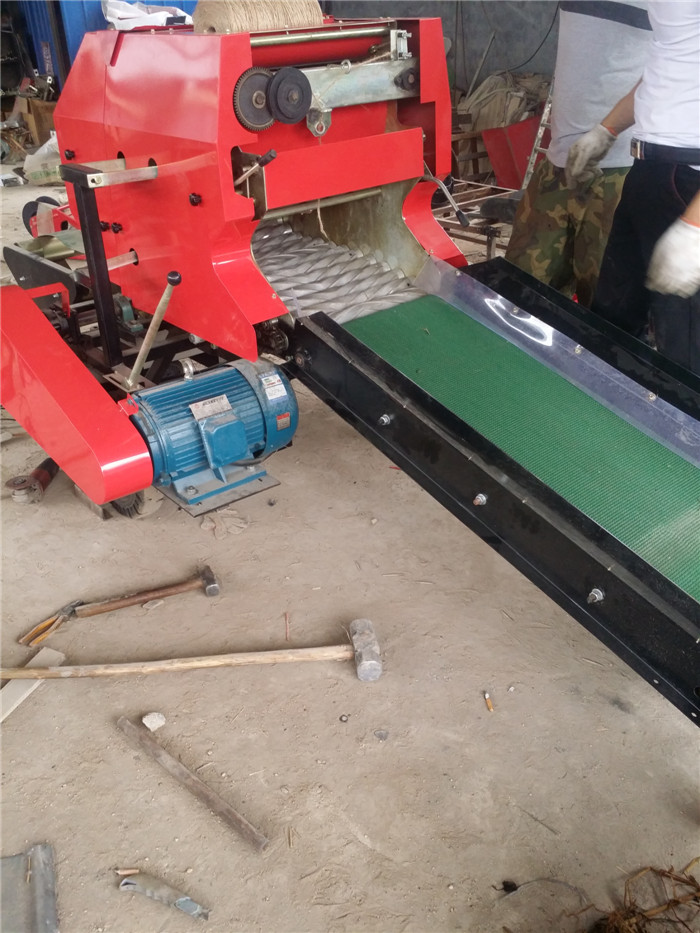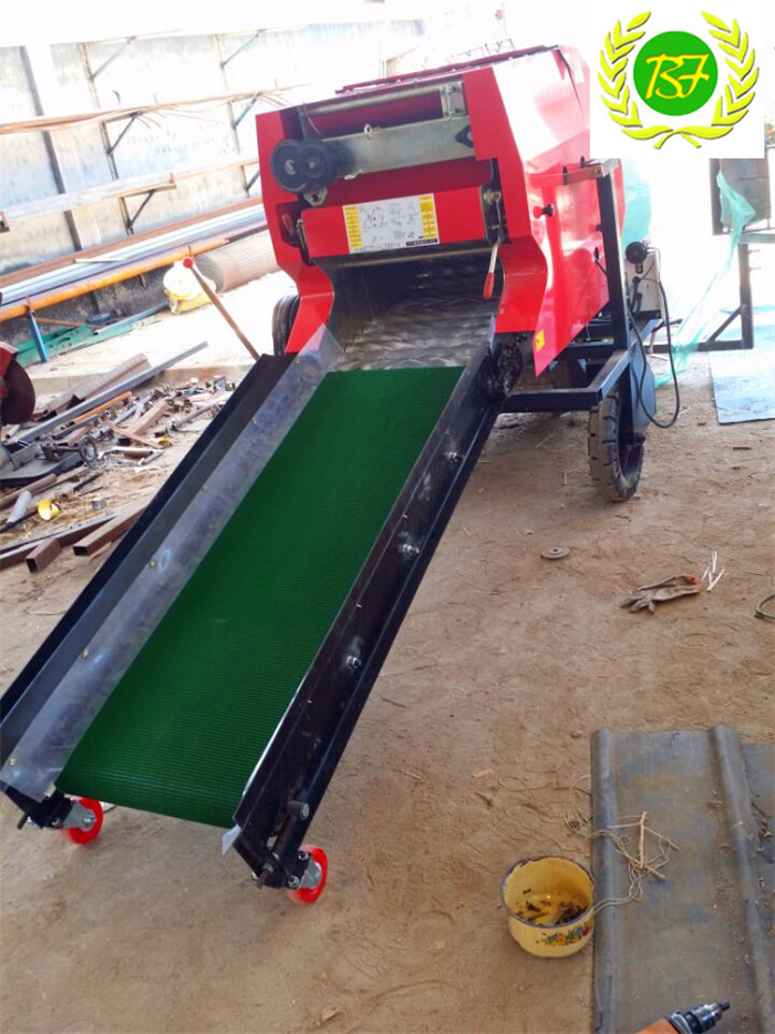 青貯打捆包膜一體機工作原理:通過機器前部人工給固定倉喂料,當草捆大到固定倉和活動倉接觸到一定密實度時,活動倉上方的惰性輥和左側(cè)的信號輪會均勻轉(zhuǎn)動,操作者板動繞線離合手柄,機器開始往復饒繩捆扎,繞繩一周,麻繩自動切斷,立即開倉放捆,草捆直接落入包膜機的旋轉(zhuǎn)架上,用手把膜拉出,啟動旋轉(zhuǎn)按鈕,旋轉(zhuǎn)架帶動草捆轉(zhuǎn)動,操作者應同步迅速將膜壓向草捆,并隨著草捆旋轉(zhuǎn)一周,然后立即松手,牧草膜逐漸逐層包裹在草捆外,草捆自隨著旋轉(zhuǎn)架公轉(zhuǎn),當包膜到設定的層數(shù)時,離合器自動脫開,旋轉(zhuǎn)架停下,操作員在草捆和輸膜架之間把牧草膜切斷,把牧草膜斷頭一端壓入草捆端面重疊處,用一人將包膜好的草捆搬入小推車內(nèi),推走擺放整齊。