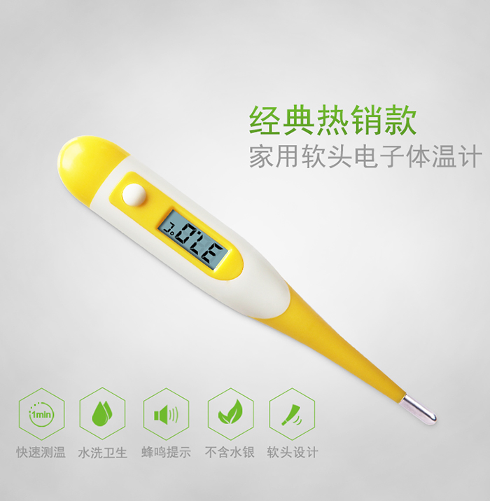 電子體溫計采購,首先考慮的就是安全。健奧電子體溫計取代傳統水銀體溫計的玻璃材質,采用安全無毒的塑料材質,這樣即使不小心摔在地上,也不怕對人體造成任何傷害。除此之外,健奧軟頭體溫計更貼心貼合皮膚,不怕戳傷人體,寶爸寶媽大可放心選購。