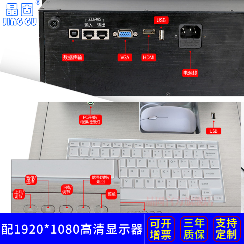產(chǎn)品介紹:自帶高清屏幕:屏幕分辨率可到達(dá) 1920*1080P,寬高比16:9;表面定做高清絲印玻璃,保障屏幕視覺效用。機(jī)身全鋁結(jié)構(gòu),自帶高清顯示器,支持HDMI和VGA兩路信號(hào)切換,支持定做。優(yōu)質(zhì)鋁材精雕加工,散熱性能好,讓設(shè)備異常輕便,美觀,大氣。支持遙控中控。屏幕自動(dòng)翻轉(zhuǎn)105°,自動(dòng)斷供電功能。是您辦公的最佳伙伴!