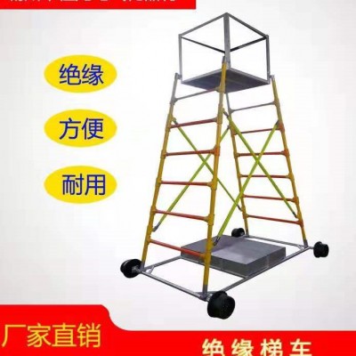 梯車(車梯)選用高強度絕緣材料制造,型材截面設計合理,重量輕,車梯底架用鋼管制造,保證底架的穩定性和安全性,不變形。車輪為稀土尼龍輪強度高、運轉無噪音、絕緣性能好,其中有一車輪鑲嵌鋼環,解決安全接地問題。