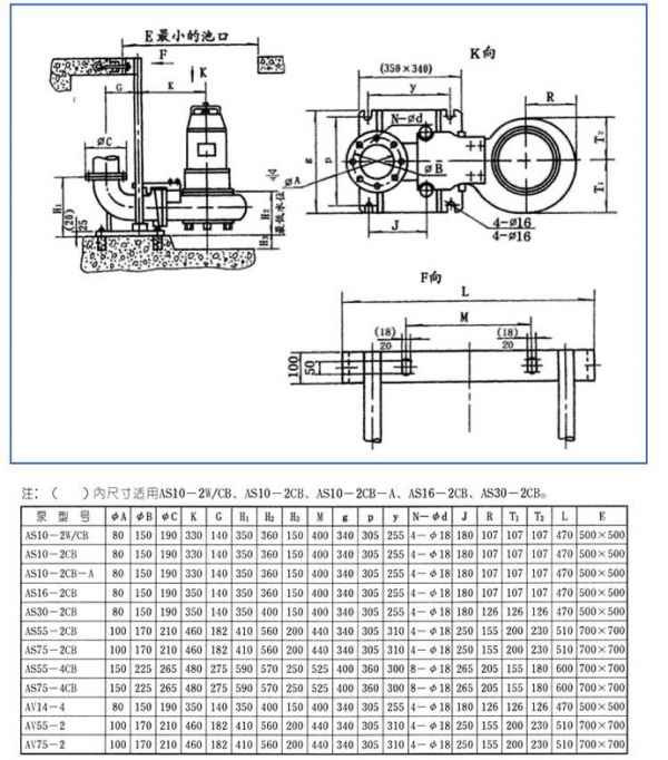 2. 在移動使用時,出水軟管可用前面表格規定的標準軟管接頭,接在水泵的出水彎管上,固定使用時,可根據自耦裝置的法蘭標準設置管路;