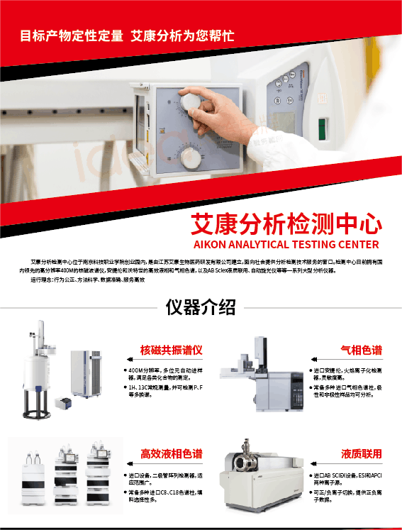 南京艾康全心分析檢測(cè)中心目前擁有國(guó)內(nèi)高分辨率400M的核磁共振波譜儀,全套Agilent系列的液質(zhì)聯(lián)用儀、氣質(zhì)聯(lián)用儀、*液相儀、氣相色譜儀以及各種理化分析儀器等一系列大型分析儀器。