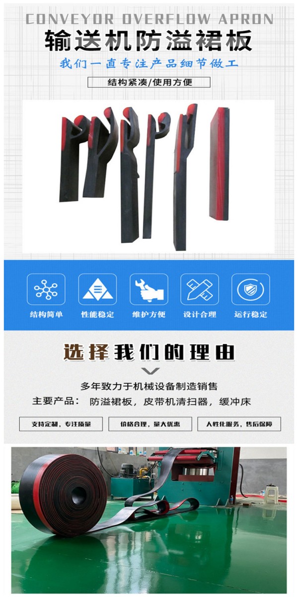 防溢裙板用于輸送帶與導(dǎo)料槽之間密封和緩沖床與導(dǎo)料槽之間的密封,安裝主要是:蝶形螺母式和手柄式兩種方法,直接安裝在皮帶機(jī)導(dǎo)料槽的下沿。