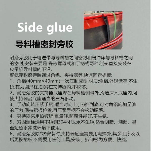 旁膠由帶狀橡膠板和底部的聚氨酯塊組成,聚氨酯塊通過熱硫化工藝與橡膠板緊密結合,能夠承受長時間的摩擦而不與橡膠分離。這種結構設計不僅提高了耐磨性,還確保了旁膠的使用壽命長,且不會損傷皮帶。
