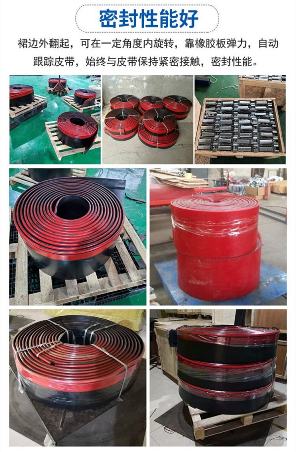 旁膠使用專用的防溢裙板夾持器進行安裝。一段固定在導料槽上,底部聚氨酯部分直接與皮帶接觸,通過角鋁壓緊裙板,可保證導料槽與皮帶之間密封。也可以使用普通螺栓固定,但效果稍弱一些。