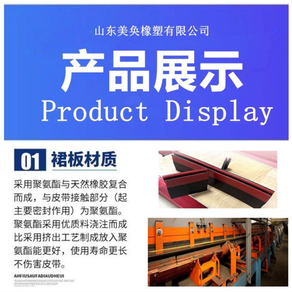 3. 雙層防護防溢裙板,導料槽密封系統,Y型固定膠塊,裙邊主體采用一次性一體熱硫化方式制成,結構緊湊有效,結實。背面的型固定膠塊可根據客戶要求在制作的過程中去掉,以適應過去老的安裝。