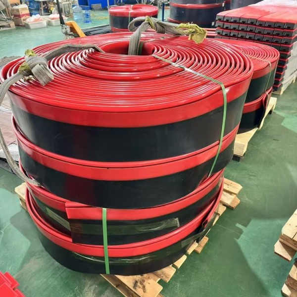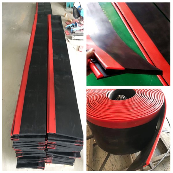 1. 防溢裙邊的主體部分為黑色,采用 橡膠和丁苯橡膠混煉而成,在保持挺括的基礎上增加彈性,使紅色的多防護密封條緊密的貼服在輸送帶上,甚至當多護系統達到使用即將磨損完后還能夠繼續履行防溢裙邊的防溢效果。