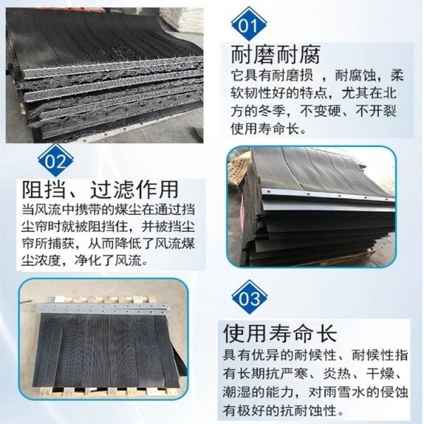 6mm橡膠擋塵簾通常由直徑6mm的橡膠條制成,具有良好的彈性、耐磨性和耐高溫性能。此外,擋塵簾還具有阻擋、過濾作用,可以有效地降低風流煤塵濃度,凈化風流。同時,擋塵簾前安裝的凈化噴霧裝置,可以使被擋塵簾捕獲的煤塵變得濕潤,然后沖洗流至巷道底板,成為不浮游的沉積煤塵。
