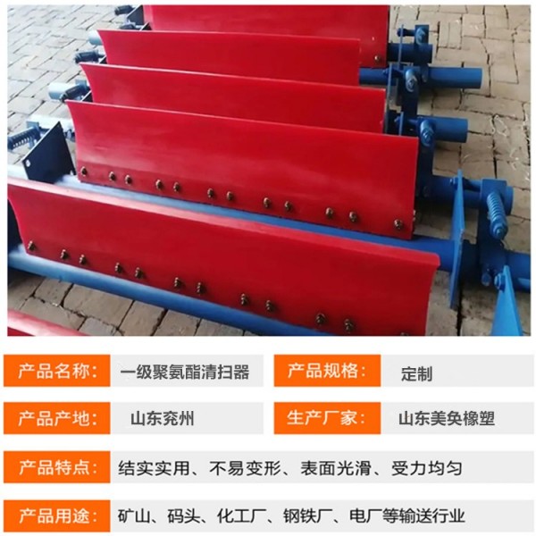 清掃器刮板采用聚氨酯高分子材料制作,具有阻燃抗靜電性、高耐磨性、高彈性、耐酸堿性、摩擦系數低等特點,不會對輸送帶造成損傷,使用壽命長。