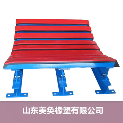 緩沖床作為緩沖托輥的替代產物,緩沖床上緩沖條與皮帶面與面的接觸,為帶式輸送機落料點提供全面的支撐。在落料點使用緩沖床可與導料槽配套結合使用,防止了落料點飛濺及散落。