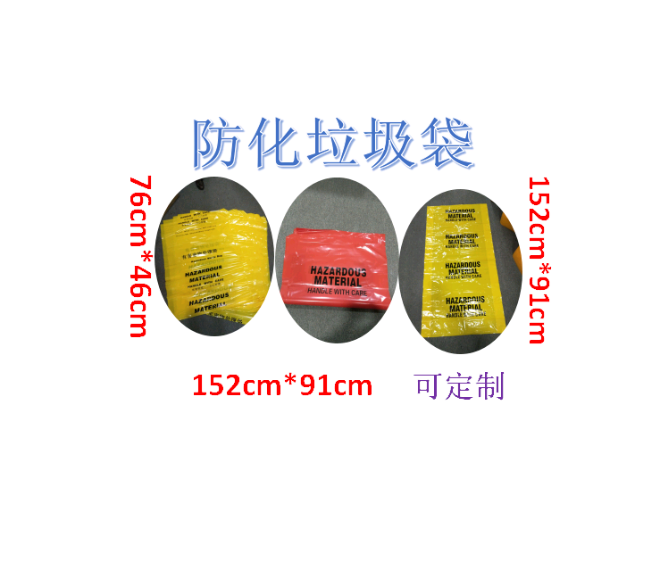 防化垃圾袋,又稱為“有害廢物垃圾袋”、“有害廢物處理袋”。英文名稱為 “Hazardous Waste Bags”、 “Hazardous Material waste bags”、“Hazardous Material Disposal Bags”。材質厚度顏色編輯一般為堅韌的聚乙烯材質,少數也有PP聚丙烯材質的。單面的厚度一般在8絲。當然,也可依據實際 需要,做得比8絲更厚。顏色一般為黃色,這樣就更顯眼,更易識別。袋子上一般印有“有害廢物”的警示的內容或者“小心處理”的警示內容。 Carries bold "Caution Handle With Care" reminder。