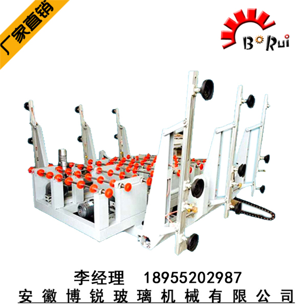 主要用于玻璃的自動取片。將玻璃放在指定位置,給出取片信號后,取片吸盤自動翻起并將玻璃吸附后放置在取片臺傳送輥道上,自動將玻璃輸送到切割機主機上。