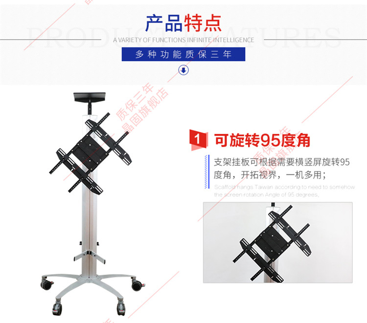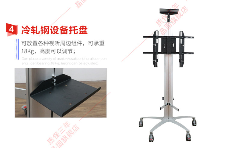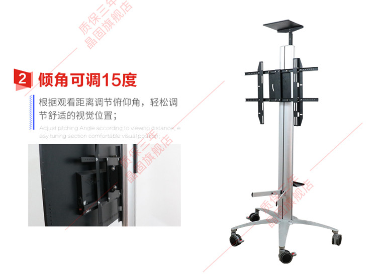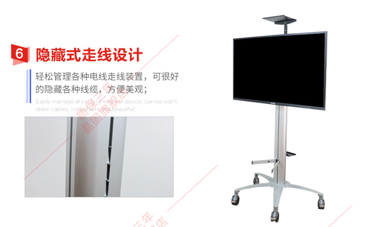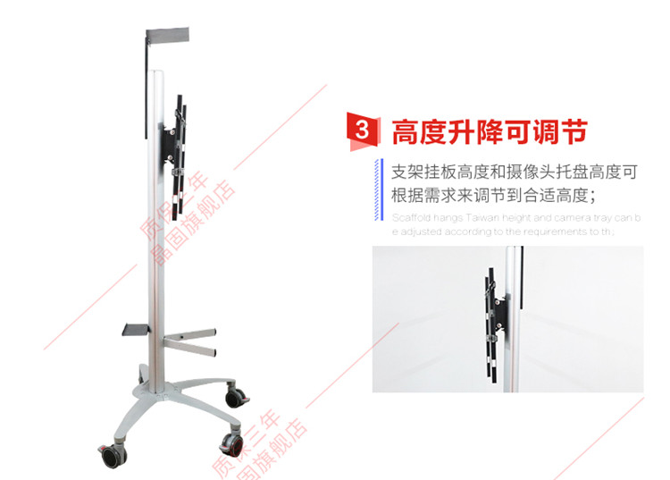 產品特點介紹:可旋轉95度角。支架掛板可根據需要橫豎屏旋轉95度角,開拓視界,一機多用;傾角可調15度,根據觀看距離調節俯仰角,輕松調節舒適的視覺位置;高度升降可調節,支架掛板高度和攝像頭托盤高度可根據需求來調節到合適高度;冷軋鋼設備托盤,可放置各種視聽周邊組件,可承重18kg,高度可以調節;靈活帶剎車萬向輪,隨心移動,推巧靈巧靜音,快捷方便;隱藏式走線,輕松管理各種電線走線裝置,可很好的隱藏各種線纜,方便美觀
