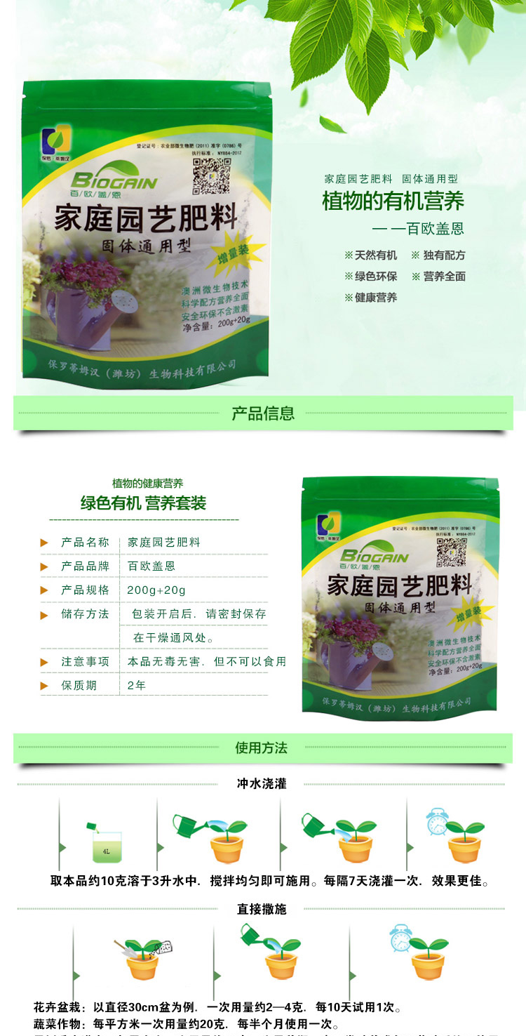 沖水澆灌 :取本品約10g溶于3升水中,攪拌均勻即可使用。每隔7天澆灌一次,效果更佳。
